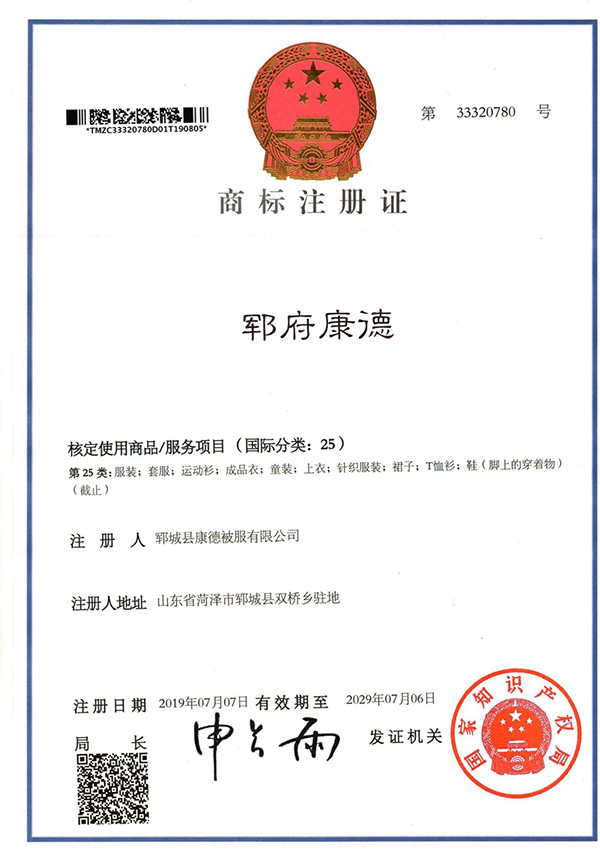 24類床上用品商標(biāo)注冊證